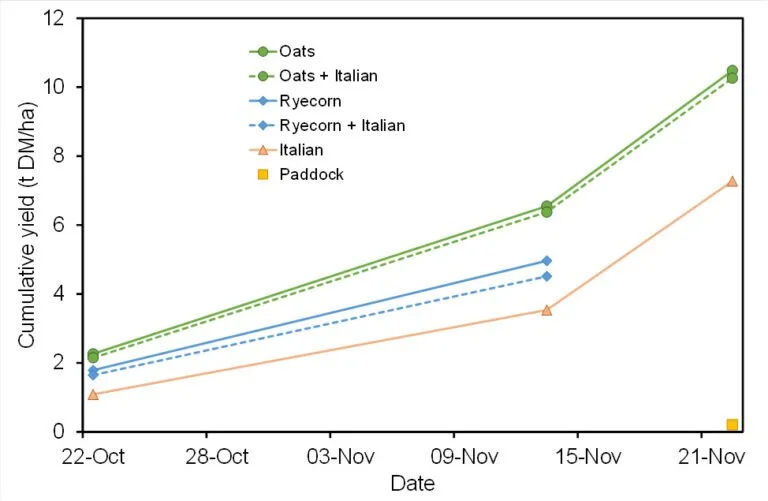All farm sites were essentially treated the same, sown with different combinations of oats, ryecorn and Italian ryegrass, however the Middlemarch site was also planted with barley, and cultivation vs direct drilling treatments were test at Ashburton Lakes. Large strips of approximately 4 metres wide by 40 metres long were planted for the trials.